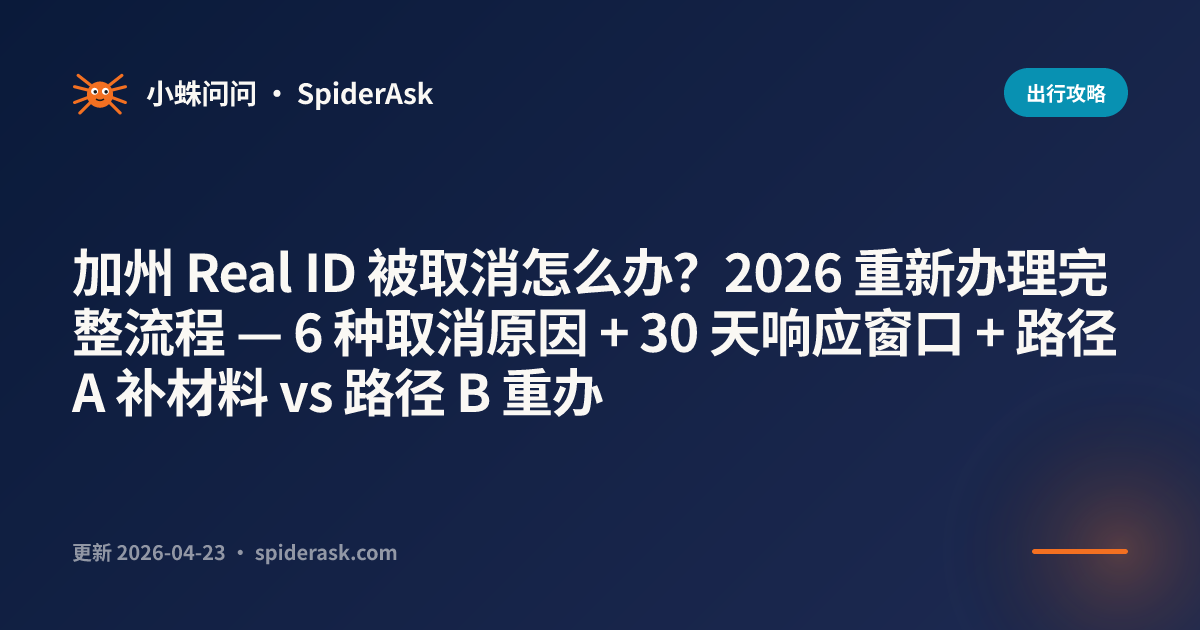 📚 本页为 CA DMV Real ID 撤销 / 取消后处理流程公开信息汇总,不构成法律 / 移民建议。实际 CA DMV 规则和流程以收到的 official notice + dmv.ca.gov 当前规则为准。涉及复杂身份问题(visa 即将过期 / change of status pending / 曾因 immigration violation 被拒)建议同时咨询持牌移民律师。